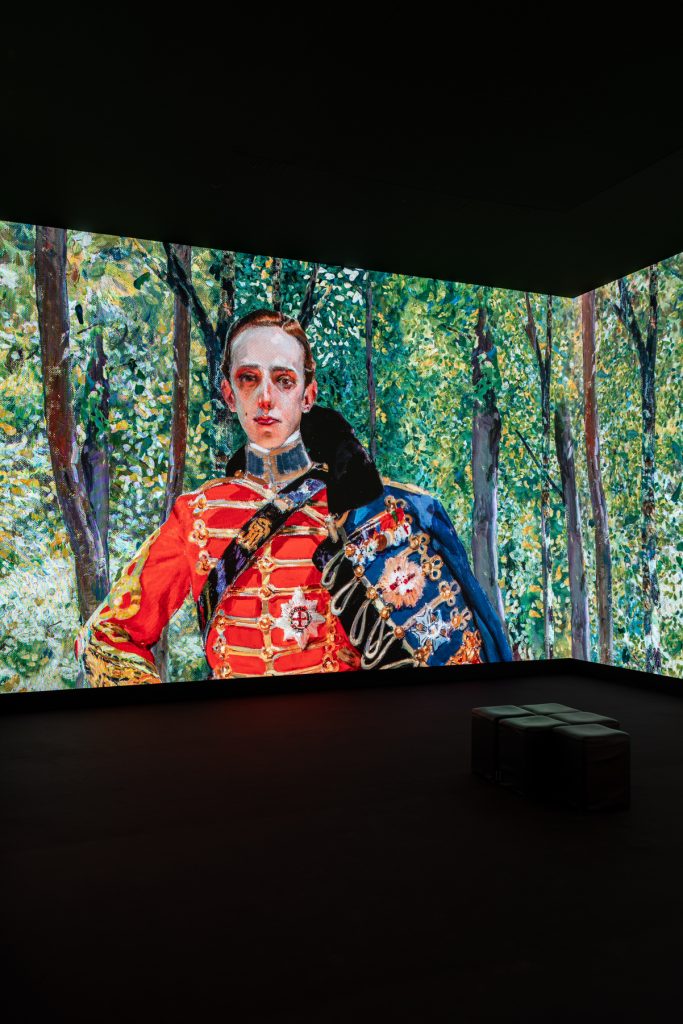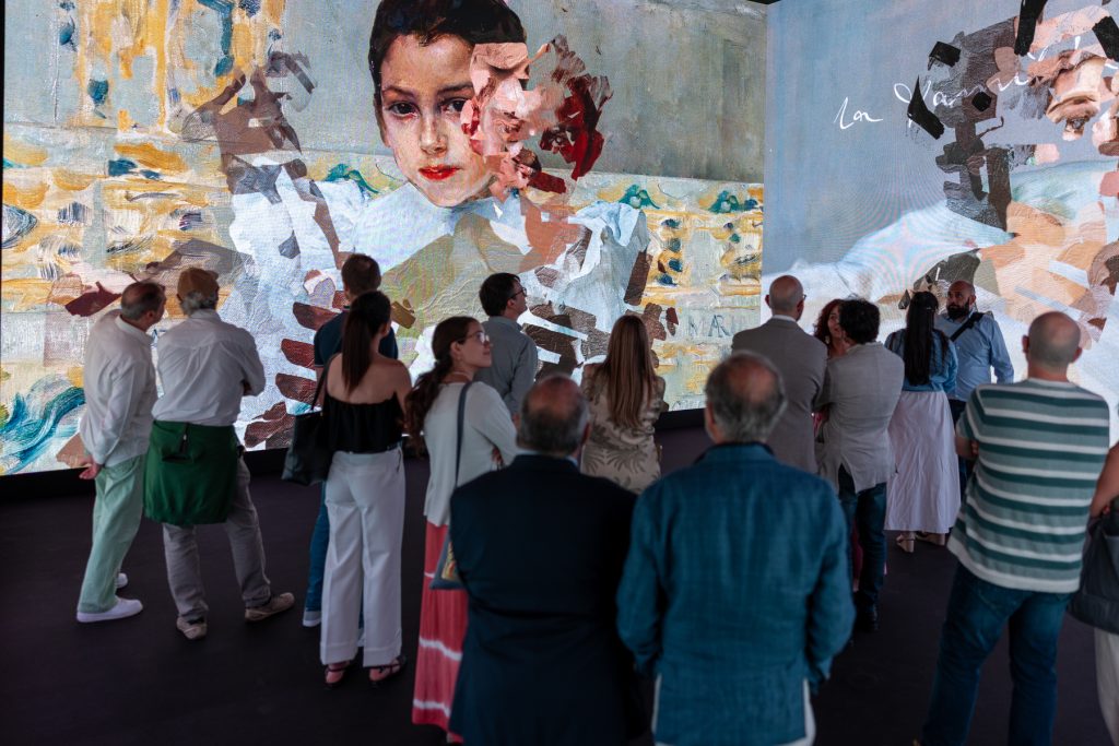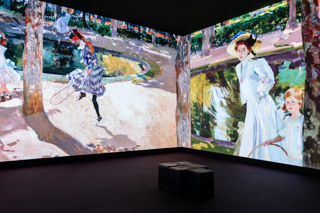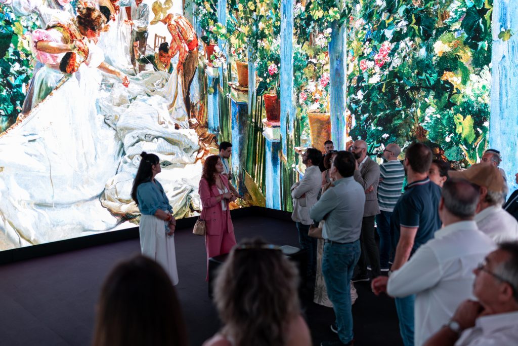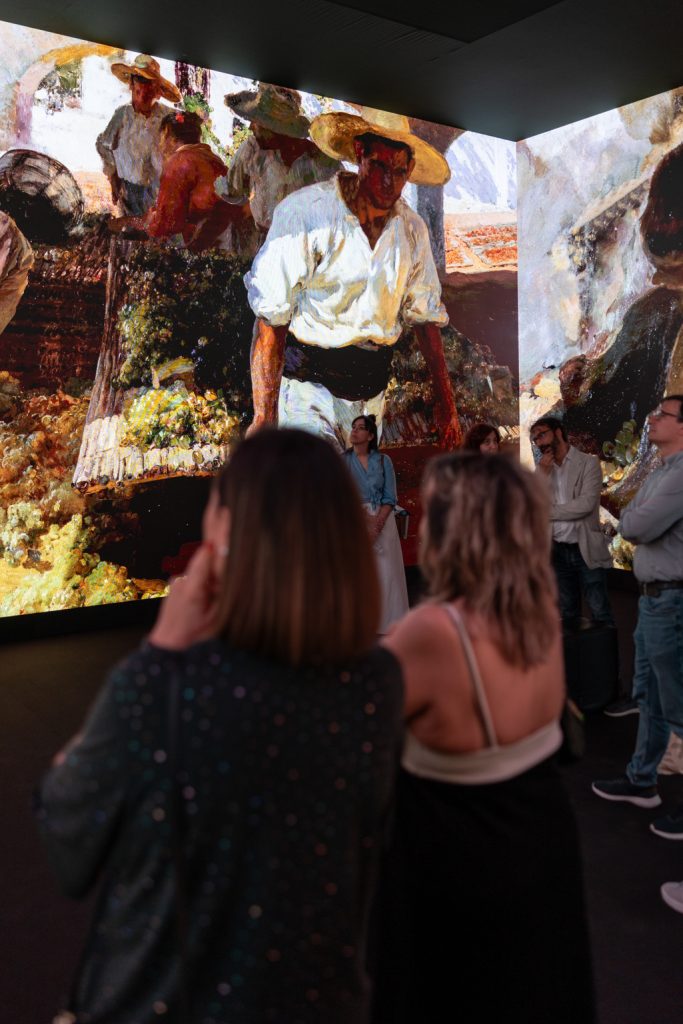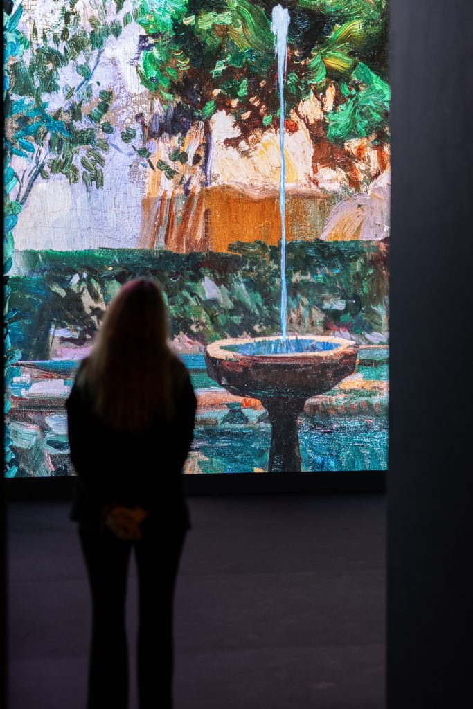 Salas cubiertas por multipantallas LED que abarcan todo el perímetro del espacio. Cientos de imágenes en movimiento formadas por pinturas de distinto formato, fotografías y artículos de periódico, acompañados de dibujos y escritos personales, sumergen al espectador en las obras de Sorolla junto a una música envolvente. La banda sonora, compuesta especialmente para esta experiencia sensorial, sugiere la atmósfera de las imágenes.