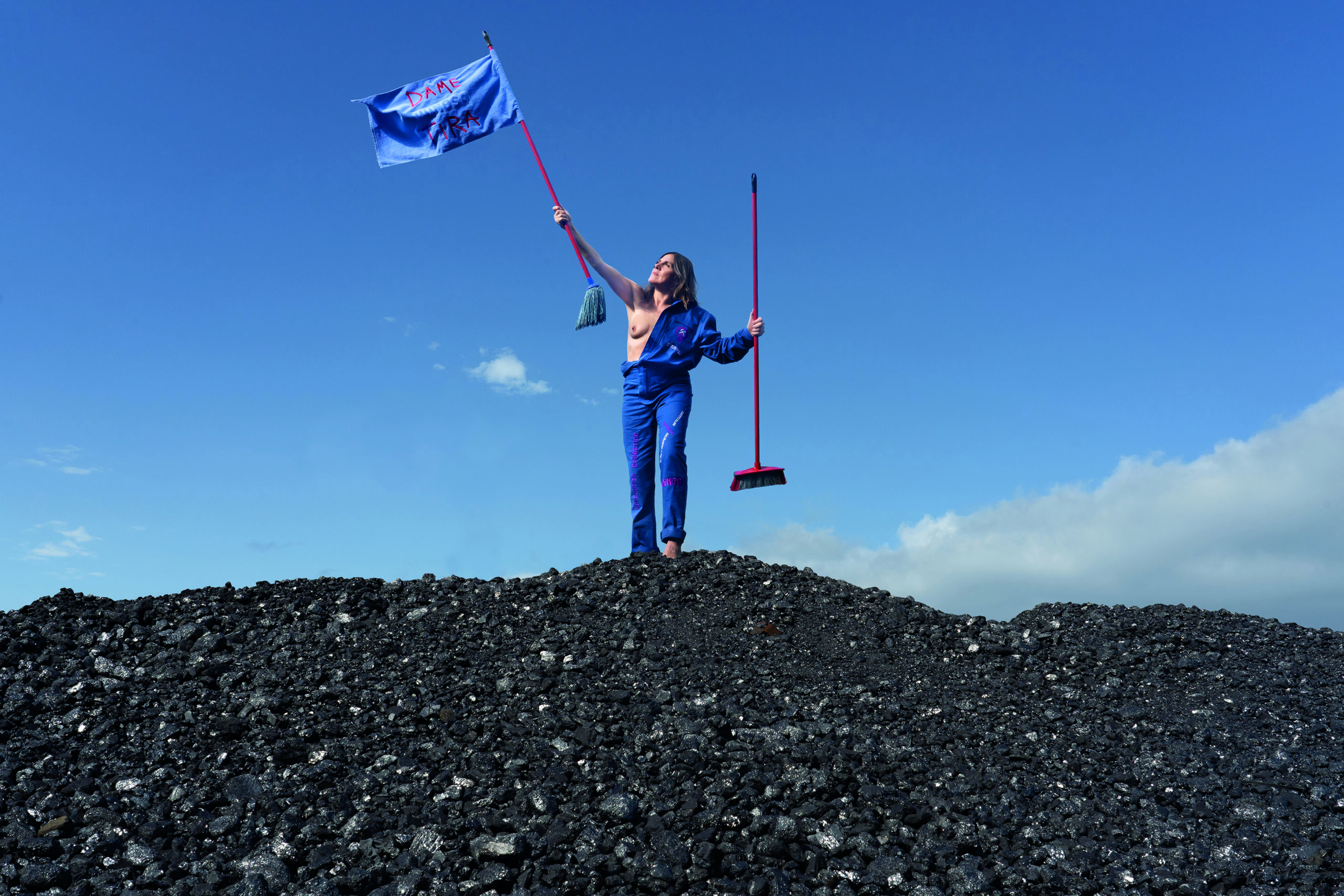 Vestida con un mono de trabajo —elemento autobiográfico y alegórico—, la artista aparece en una fotografía inspirada en La libertad guiando al pueblo de Delacroix, trasladando esta icónica imagen al contexto de la minería y la lucha por la igualdad con ironía y sentido del humor, en un tono combativo que reflexiona sobre el impacto vital de las mujeres en la comunidad minera.