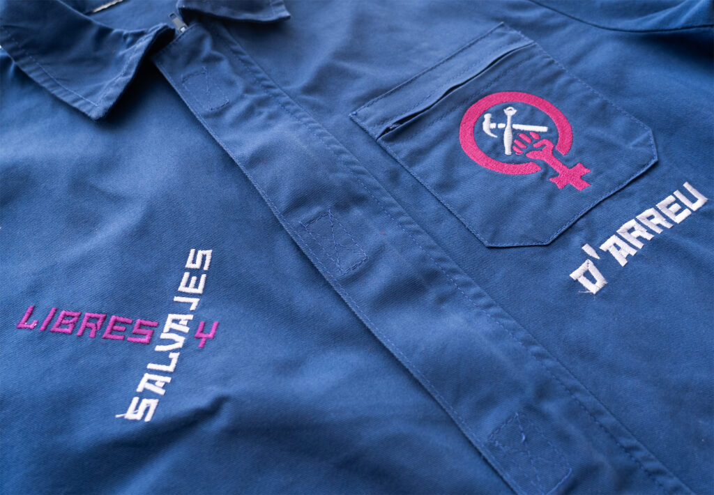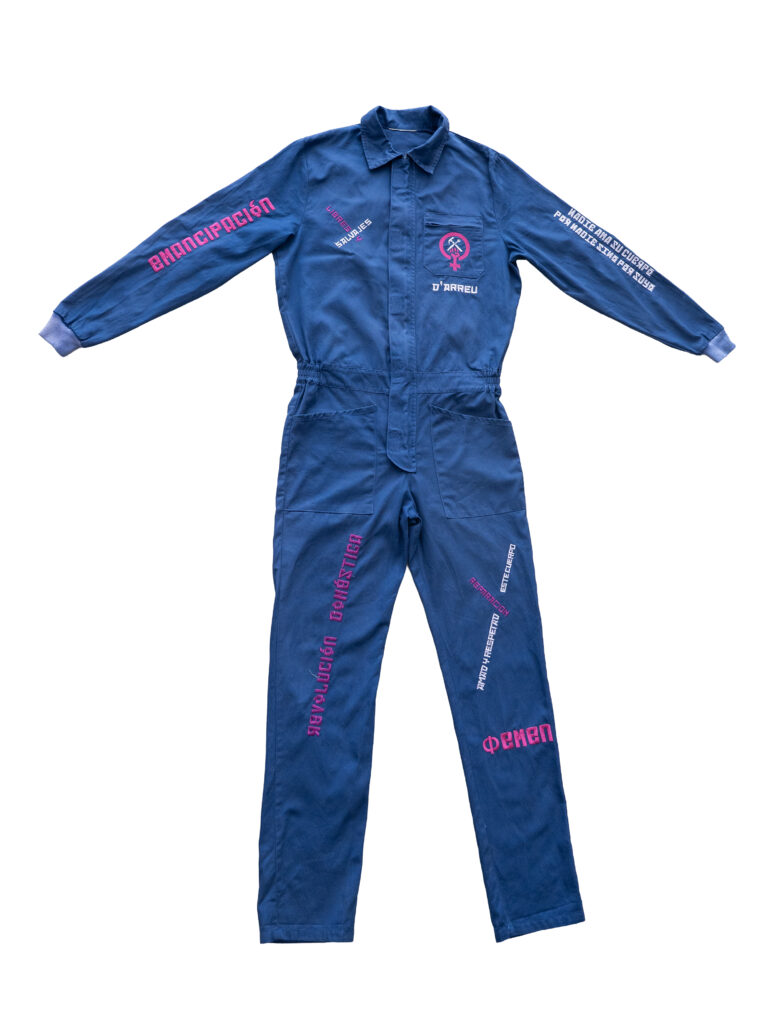 El mono expuesto funciona como tributo a las mujeres de la revolución: intervenido con frases bordadas de consignas feministas del 8M y reinterpretaciones de mensajes vinculados a la lucha obrera, al trabajo y al sistema paternalista, plantea un contrarrelato frente a los discursos de adoctrinamiento históricos.