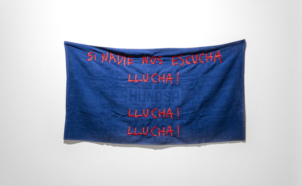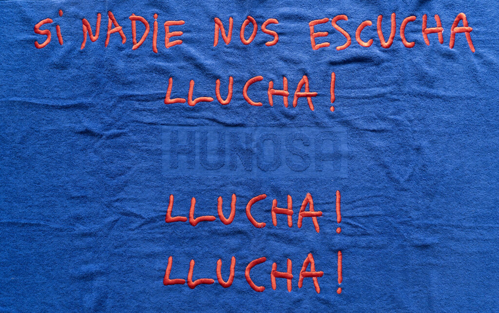 De manera paralela, los bordados sobre toallas de HUNOSA recogen consignas y mensajes de protesta de pintadas, manifestaciones y pancartas callejeras, subvirtiendo ideologías dominantes y visibilizando la contribución femenina en la historia del movimiento obrero.